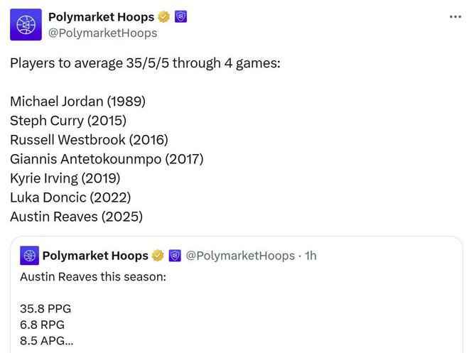 这让里夫斯成为NBA历史上第7位在开季前四场至少拿下35分5篮板5助攻的球员,此前6人分别是乔丹、库里、威少、字母哥、欧文和东契奇。